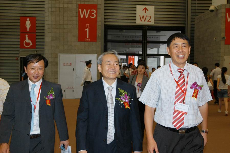 在中國國際貿促會紡織行業分會常務副會長張延愷(右一)、秘書長揚兆華陪同下參觀博覽會