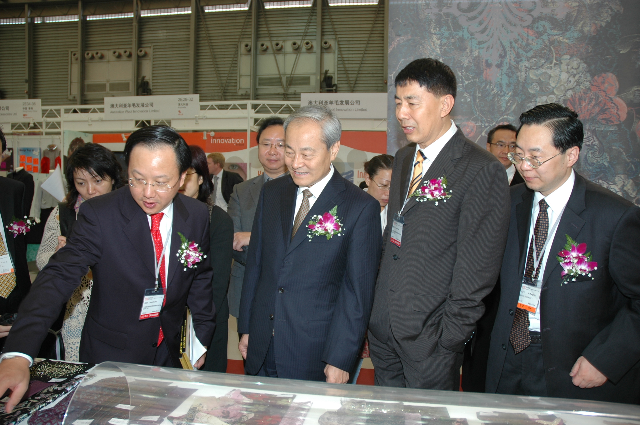 中國紡織工業(yè)協(xié)會會長杜鈺洲在主辦方中國貿(mào)促會紡織行業(yè)分會常務副會長張延愷和秘書長揚兆華陪同下參觀