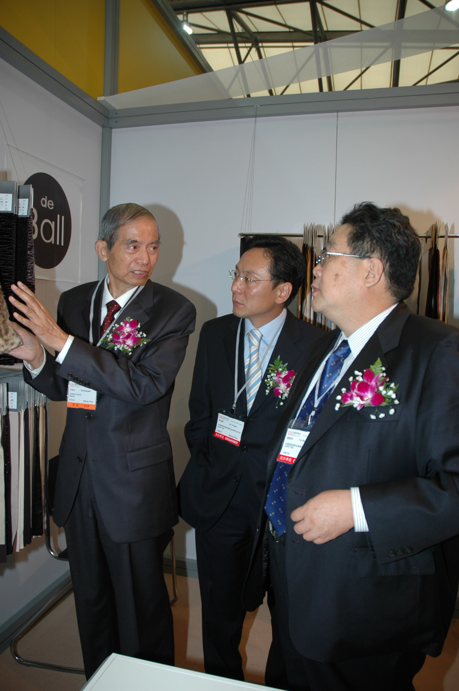 中國紡織工業(yè)協(xié)會副會長許坤元在主辦方中國貿(mào)促會紡織行業(yè)分會副會長富榮沛和徐迎新陪同下參觀