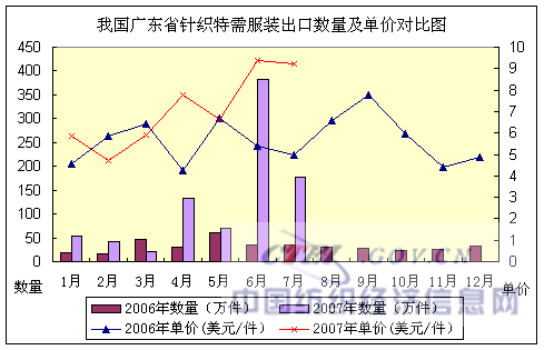 2007年1~7月,我國廣東省針織特需服裝出口:數(shù)量882萬件,同比增長267.84%,出口金額7364萬美元,金額同比增長441.57%,出口平均單價(jià)8.35美元/件,單價(jià)同比增長47.27%。