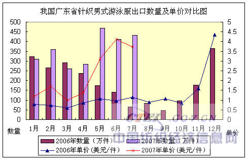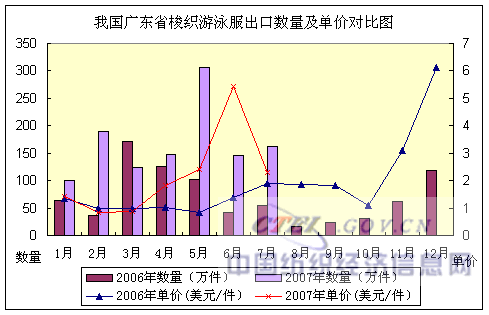 2007年1~7月,我國廣東省梭織游泳服出口:數(shù)量1174萬件,同比增長97.31%,出口金額2579萬美元,金額同比增長287.14%,出口平均單價(jià)2.2美元/件,單價(jià)同比增長96.43%。