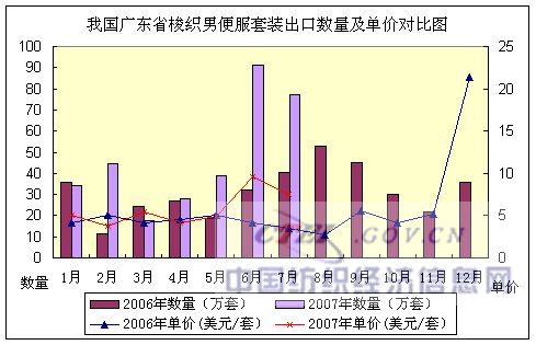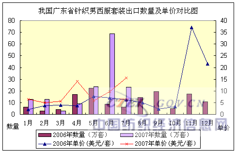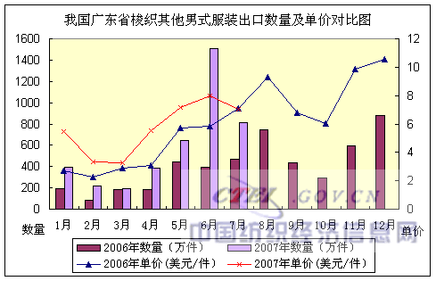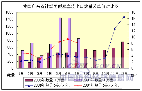 2007年1~7月,我國廣東省梭織男便服套裝出口:數(shù)量332萬套,同比增長74.95%,出口金額2194萬美元,金額同比增長173.83%,出口平均單價(jià)6.62美元/套,單價(jià)同比增長56.50%。