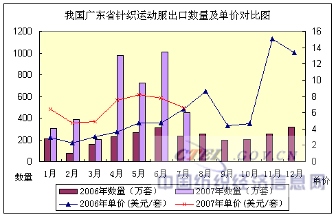 2007年1~7月,我國廣東省針織運(yùn)動服出口:數(shù)量4061萬套,同比增長173.27%,出口金額2.90億美元,金額同比增長357.50%,出口平均單價(jià)7.14美元/套,單價(jià)同比增長67.21%。