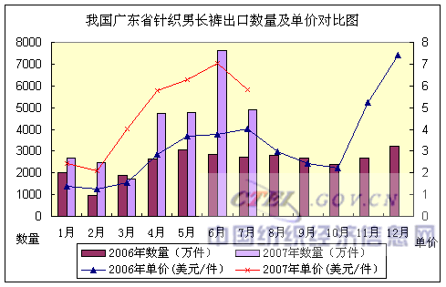 2007年1~7月,我國廣東省針織男長褲出口:數(shù)量2.89億件,同比增長79.16%,出口金額15.83億美元,金額同比增長233.98%,出口平均單價(jià)5.47美元/件,單價(jià)同比增長86.05%。