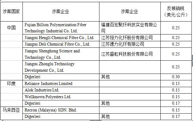 2017年7月12日,土耳其經(jīng)濟(jì)部發(fā)布公告,對(duì)原產(chǎn)于中國(guó)、印度和馬來西亞的滌綸扁平紗(土耳其語(yǔ):Diğerleri, poliesterlerden)作出反傾銷期中復(fù)審肯定性終裁并對(duì)涉案產(chǎn)品征收0.15~0.30美元/公斤的反傾銷稅(詳見下表)。本案涉及稅號(hào)5402.47項(xiàng)下的產(chǎn)品。