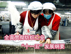 To carry out‘the Eleventh Five-Year Plan Guideline for National Economy and Social Development’, the State Development and Reform Commission (SDRC), together with China National Textile and Apparel Council (CNTAC),has mapped out‘the Eleventh Five-Year Plan Guideline for Textile Industry in China’in an active effort to push forward scientific and technological progress,focusing on indigenous innovation for a shift to a new growth model, upgrading & optimizing industrial structure,striving for a complete, coordinated and sustained development in Chinese textile industry.