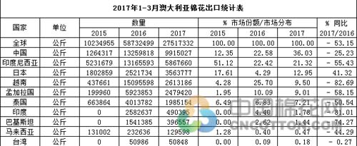 2017年1-3月,澳大利亞累計出口棉花2.75萬噸,主要出口至中國(9915噸)、印度尼西亞(5868噸)、日本(3564噸)、越南(2613噸)和孟加拉國(2479噸)。據(jù)了解,1-3月份,澳棉出口量大幅下降,同比減少53.15%,其中對中國的出口同比減少25.23%,對印尼的出口同比減少55.43%,對日本的出口同比增長41.32%。