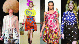 兩種不同的花色配對?不會(huì)有太過扎眼的感覺嗎?這種聽起來不可思議的花色搭配竟然成為今年春夏最為時(shí)髦的配色方法之一。不少人看了秀場圖片已經(jīng)開始躍躍欲試,但看起來放肆張揚(yáng)的色彩配搭卻不那么簡單。Louis Vuitton 和ProenzaSchouler 的花色配搭最為大膽,前者豎條紋+ 橫條紋+ 不同顏色豎條紋的組合隨意之中卻有著不可打破的玄妙感,后者則是用對比色玩色彩游戲,上半身的黃藍(lán)虎紋以及下半身的綠色碎花犀利卻不容易模仿,差一絲一毫都會(huì)顯得俗氣。Thakoon 的紅色系花色搭配也有同樣問題。Marc by MarcJacobs 算是最為親民的版本了,用常見的糖果色印花tee 搭配同樣暖色系的涂鴉半裙,有著“亂來”的率性感。而冷色系的代表Miu Miu 也值得一試,上下半身的顏色相近,而相似的圖案卻有著不同密度的排列組合,是富有規(guī)律的易學(xué)造型。