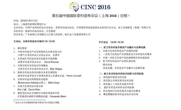 第五屆中國國際非織造布會議(上海2016)定于2016年10月13日在上海召開。