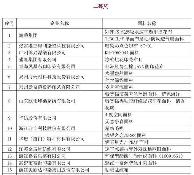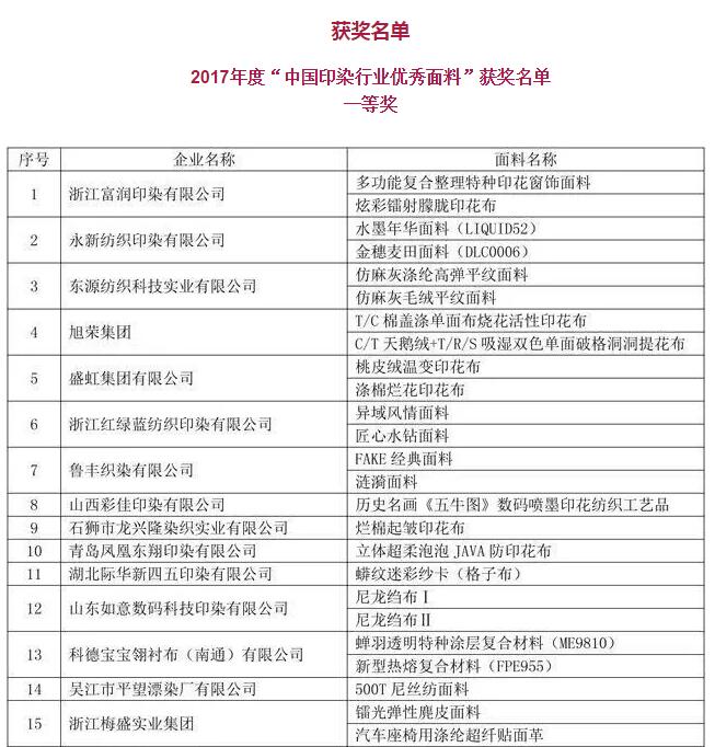 中國印染行業(yè)協(xié)會自2010年起開展“中國印染行業(yè)優(yōu)秀面料”評選表彰活動以來,影響廣泛,2017年的評選活動同樣吸引了諸多印染企業(yè)的積極參與,最終評出一等獎33個、二等獎38個。(文尾附獲獎名單)