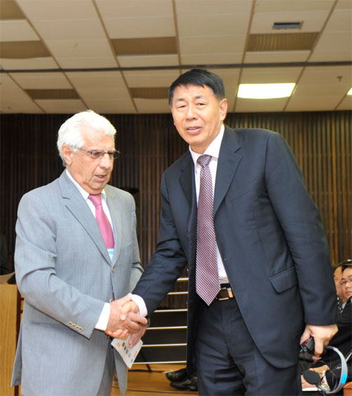 巴西服裝協會總裁Roberto Chadad(左一)與中國紡織工業聯合會副會長張延愷(右一)親切握手交談交談