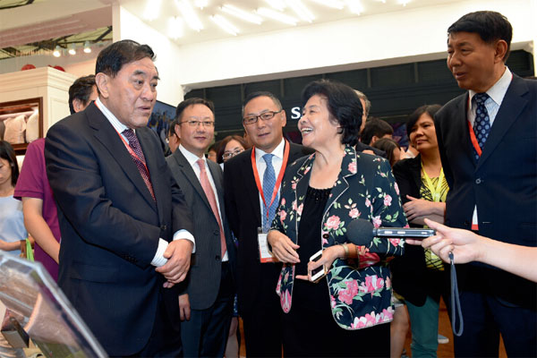 中國紡織工業聯合會會長王天凱(前左一)、副會長張延愷(前右一)等領導在中國國際貿促會紡織行業分會常務副會長徐迎新(后左三)、中國家用紡織品行業協會會長楊兆華(后左二)陪同下參觀展會