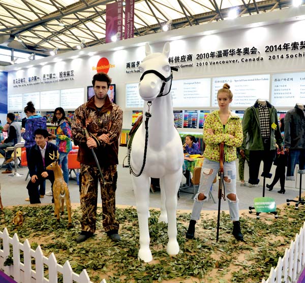 1、一匹白馬, 兩個手持獵槍的洋模特,這個新穎的展位設計吸引了不少觀眾駐足拍照。原來這是位于E5 館昆山華陽紡織染整有限公司的展位。新穎的設計加上過硬的產品為企業帶來了商機,據介紹, 僅展會這幾天該公司就接待了數百個客戶。