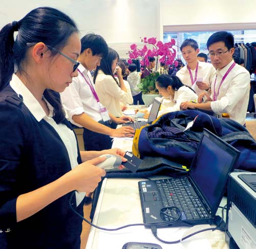 2、在江陰龍陽紡織有限公司展位,記者看到,觀眾紛紛拿著自己心儀的面料排隊交給工作人員。原來,龍陽紡織的每一款參展面料都設有二維碼,觀眾只要將看中的面料交給工作人員掃描,同時錄入買家地址,公司總部就會即時得到相關信息并組織發樣品,效率大大提高。