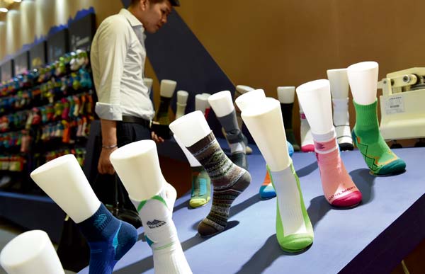 7、一家企業展出的戶外功能性襪子。這里的每一雙襪子都具備最佳舒適性以及透氣快干、超強耐磨、抗菌除臭的功能。