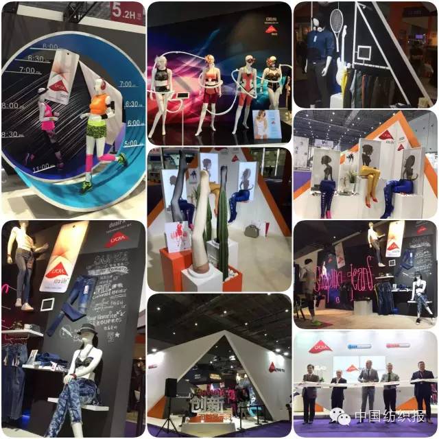英威達的萊卡產(chǎn)品廣泛應(yīng)用于牛仔服、泳裝等領(lǐng)域,其展位設(shè)計也圍繞下游應(yīng)用展開,設(shè)計得時尚范兒、國際范兒十足。半體模特與卡通圖案相結(jié)合的陳列方式,陳列背景板色彩的搭配以及與模特著裝色彩渾然一體的呼應(yīng)共同體現(xiàn)出的時尚感……這些對于萊卡纖維的時尚化、國際化的表達和傳播方式,都值得國內(nèi)化纖企業(yè)借鑒和學(xué)習(xí)。