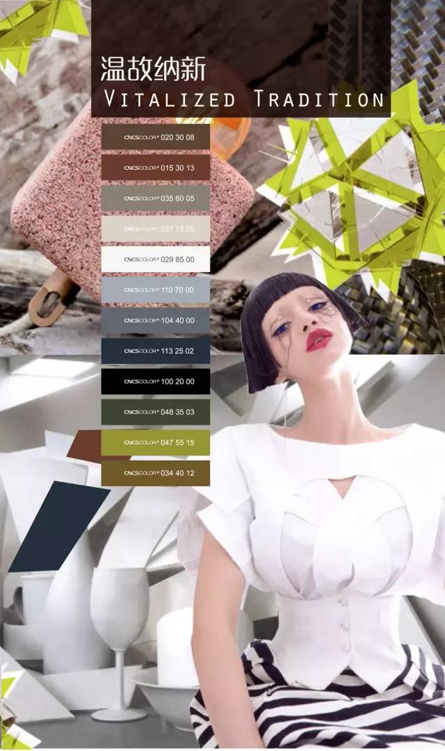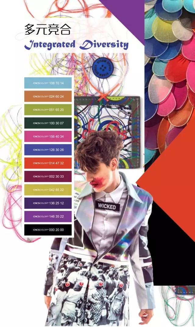 活躍的氛圍營造出織物設計的靈動,豐富的想象力渲染出織物非常規的觀感。新的科技概念與紡織技術通過藝術實驗的手法組合的淋漓盡致。數碼化的民俗圖案,現代藝術風格的圖案,色彩跳躍的花飾紗毛織物,飽滿挺闊的裝飾覆膜織物,膨脹而有活力的3D織物,花飾絎縫或壓花織物。帶有立體空間效果的面料,漆面效果皮革,染整科技制造的自然外觀,科技感的金屬光澤面料,裝飾動感絎縫的效果。