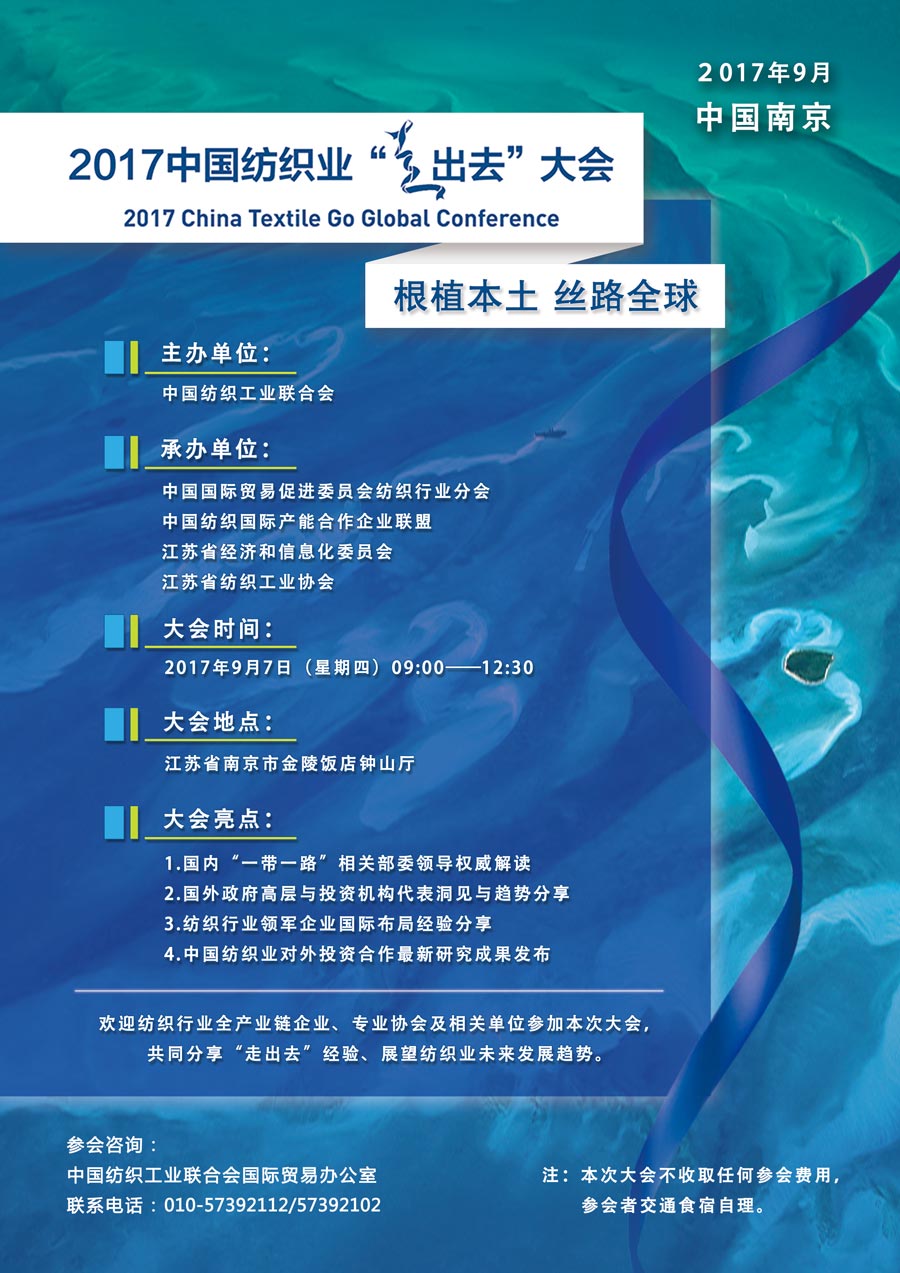9月7日,由中國紡織工業聯合會主辦的2017中國紡織業"走出去"大會將在江蘇省南京市正式舉行。本屆"走出去"大會是繼2013、2015年成功舉辦了兩屆全行業"走出去"交流活動之后的又一次重要盛會。