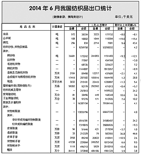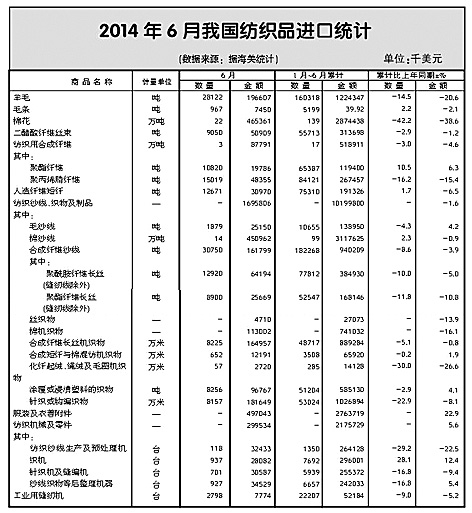 2014年以來,日本市場在我國出口中的地位進一步下降,截至上半年,對日出口額占總出口額的比重不足9%。2~6月各月出口全部下降,1~6月累計下降8.4%,其中主要是服裝下降11.1%所致,紡織品保持3.6%的增長。服裝中針織、梭織服裝合計出口量下降8.5%,出口單價下跌4%。