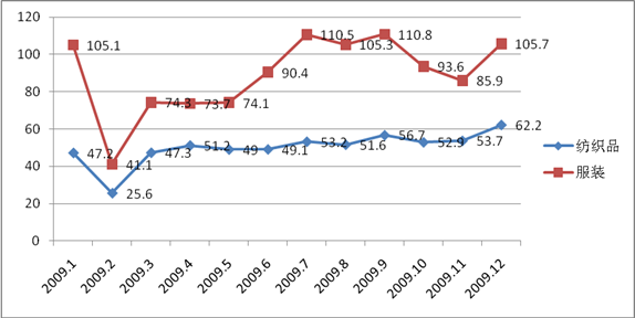 2009年月度紡織品、服裝出口金額表 (單位:億美元)