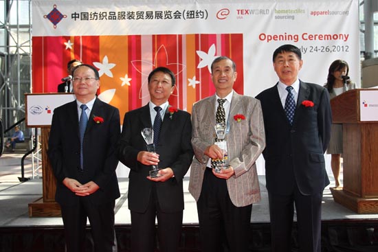 中國紡織工業聯合會副會長高勇(左一)、張延愷(右一),為連續參展超過十年的兩名優秀參展商代表陸龍生(右二)和胥培初(左二)頒發展覽會"杰出貢獻獎"
