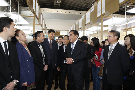 中國紡織工業聯合會會長王天凱(前右二),副會長孫瑞哲(前右一)、張延愷(前左四)等領導在中國國際貿促會紡織行業分會常務副會長徐迎新(前右三)陪同下參觀展會