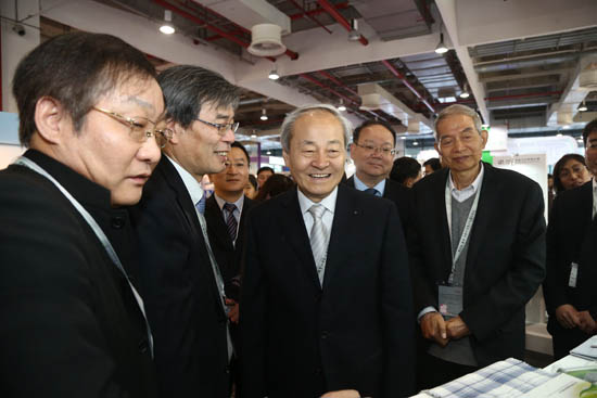 中國紡織工業聯合會名譽會長杜鈺洲(前左三)、許坤元(前右二),副會長高勇(后右三)等領導一行參觀展會
