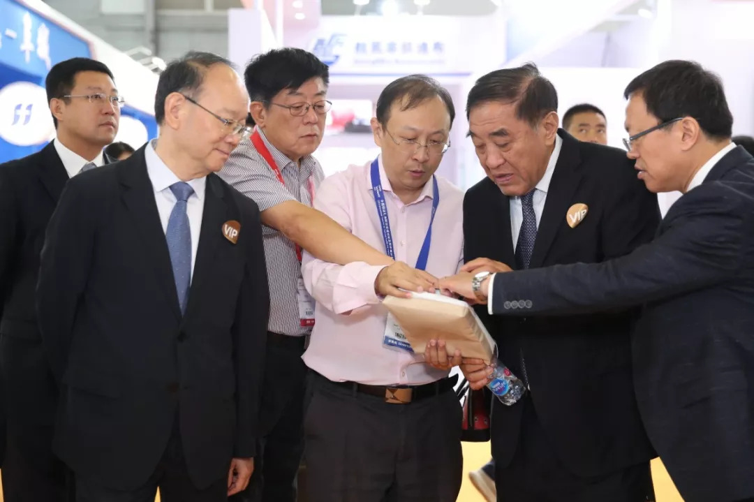 開展伊始,中國紡織工業聯合會黨委書記兼秘書長高勇,會長孫瑞哲,原會長王天凱,黨委副書記陳偉康,副會長徐迎新、李陵申,中國工程院院士孫晉良、俞建勇,工信部消費品工業司副司長曹學軍,國家發展和改革委員會產業協調司張曙光等領導及嘉賓參觀了展會。他們先后來到了位于N3館內的創新產品展示區,以傳統服飾,航空航天,環保、醫療、智能服裝,安防、應急、特品等四個品類主線進行參觀。隨后兵分兩路,分別走訪了設備及配件展區、產業用紡織品展區、非織造布展區等多個展區,并與參展企業進行了深入交流。