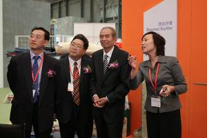 中國貿促會紡織分會副會長富榮沛陪(左一)、陳偉康(右一)在博覽會現場參觀