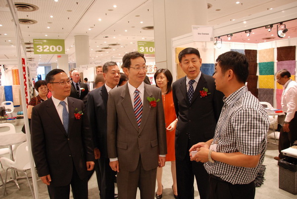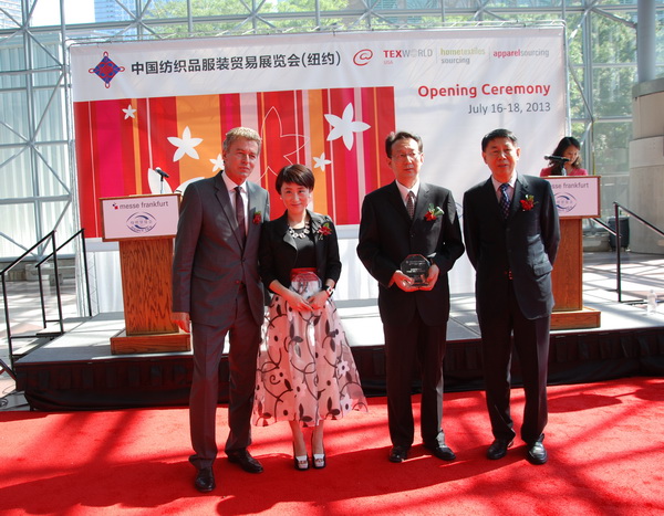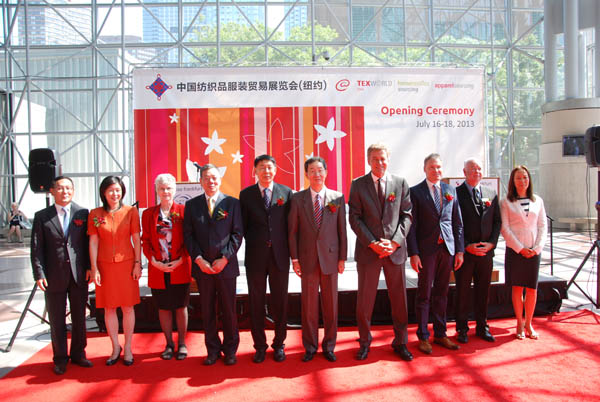 美國當地時間7月16日,第十四屆中國紡織品服裝貿易展覽會(紐約)(以下簡稱"紐約展")暨紐約國際服裝采購展(APP)、紐約家紡采購展(HTSE)和美國服裝面料展(Texworld USA)在紐約賈維茨會展中心開幕。本屆展覽會由中國紡織工業聯合會主辦,中國貿促會紡織行業分會與法蘭克福展覽(美國)公司共同承辦。中華人民共和國駐美國特命全權大使崔天凱、美國紐約市市長Bloomberg先生為展會開幕發來賀信。中國紡織工業聯合會副會長張延愷(下圖左五)、法蘭克福展覽公司董事Detlef Braun先生(下圖右四)、中華人民共和國駐紐約總領事孫國祥大使(下圖右五)分別做開幕致辭。