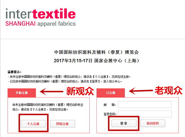 1.關注“intertextile面輔料展” 微信公眾號,點擊右下角的“觀眾中心”?“17春夏觀眾預登記” 選項,填寫完成后,3-5個工作日內可再次登錄微信公眾號?“觀眾預登記” ,查看審核結果,獲取預登記條碼。