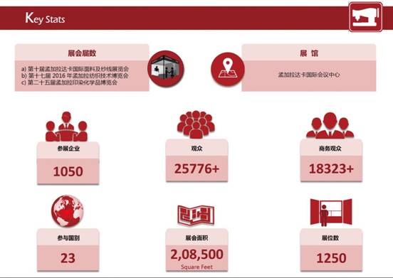 在2016年8月31日舉辦的"第十屆孟加拉達卡國際面料及紗線展覽會"中,共有來自23個國家和地區的1050家參展企業參展。印度棉紡織品出口促進協會(TEXPROCIL),基礎化學品制藥和化妝品出口促進協會(CHEMEXCIL), 印度工商聯合會(ASSOCHAM)等相關知名行業協會也參與其中。