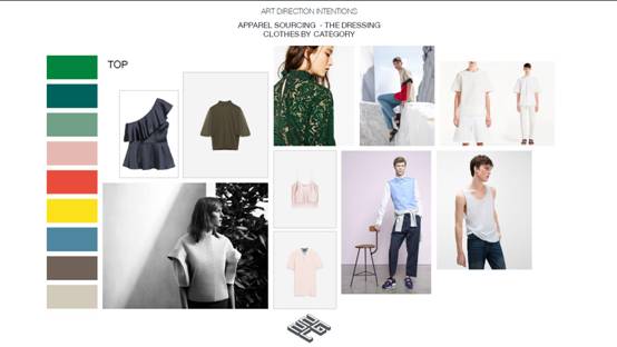 每種產品系列展示10-15件衣服,通過衣架懸掛的方式。(大約有7-10個產品系列,共計120件左右的衣服)。不同系列的產品將用不同的衣桿來展示。靜態模特也將身著產品系列服裝放置在每種展示產品系列的附近。就像商店展示中,通過網格展示和產品系列介紹放在一起。(請參考后圖)