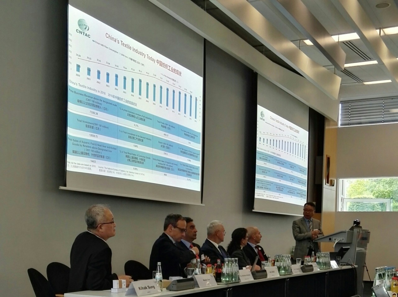 會上,國際紡聯主席、非洲棉花與紡織工業聯合會會長貝迪,國際紡聯副主席、韓國纖維產業聯合會會長成暨鶴,國際紡聯董事、巴西紡織和服裝工業聯合會會長瑟沃尼,國際紡聯前任主席、巴基斯坦全巴紡織協會董事巴塞爾,土耳其紡織企業家協會董事塞姆,西班牙棉紡協會主席胡安也先后就非洲、韓國、孟加拉、巴西、巴基斯坦、土耳其和歐洲紡織業的現狀與發展趨勢進行發言。