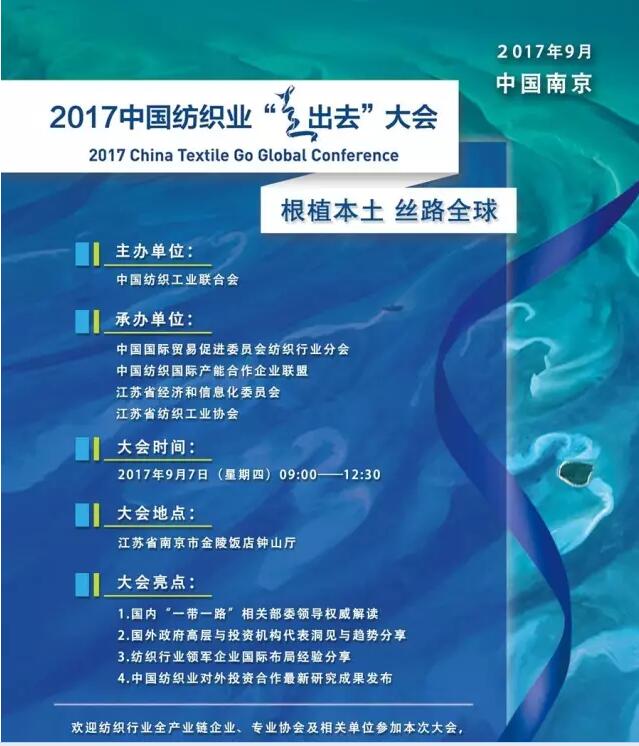 9月7日,由中國紡織工業聯合會主辦的2017中國紡織業"走出去"大會將在江蘇省南京市正式舉行。本屆"走出去"大會是繼2013、2015年成功舉辦了兩屆全行業"走出去"交流活動之后的又一次重要盛會。