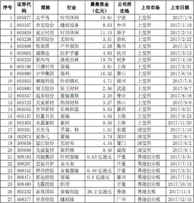 2017年全年在上海、深圳、香港三大證券交易所新增加的紡織服裝上市公司達(dá)27家,創(chuàng)歷年來(lái)單年新增紡織服裝上市公司家數(shù)新高。