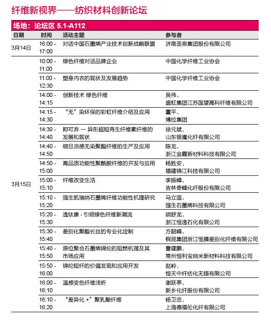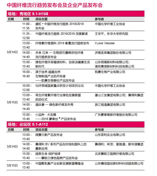 同期活動(dòng):中國(guó)纖維流行趨勢(shì)發(fā)布、紡織材料創(chuàng)新論壇、棉紡?fù)平檎搲⑵髽I(yè)發(fā)布秀、企業(yè)發(fā)布會(huì)、“新新紗線”推廣活動(dòng)