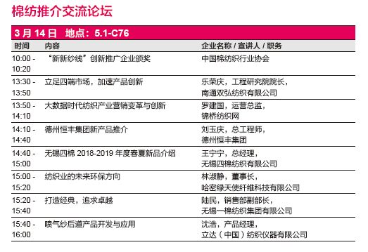 展會(huì)同期活動(dòng)有“盛虹·中國(guó)纖維流行趨勢(shì)2018/2019”發(fā)布會(huì)及企業(yè)產(chǎn)品發(fā)布會(huì)共14場(chǎng),“纖維新視界––紡織材料創(chuàng)新論壇”共16場(chǎng),“新新紗線”推廣活動(dòng)及棉紡行業(yè)推介論壇共8場(chǎng)。