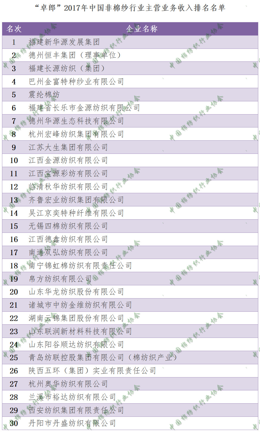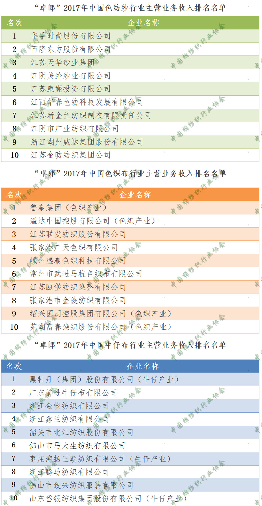 您現在的位置是:首頁 > 要聞 2017年中國棉紡織行業分類產品(非棉紗、色紡紗、色織布、牛仔布)主營業務收入排行榜發布 來源:中國紡織 發布日期:2018-04-20 字體: 【小】 【中】 【大】 近日,在中國棉紡織行業協會發布的“2017年中國棉紡織行業主營業務收入排名結果”中,同時按照分類產品的主營業務收入分別排出“非棉紗(棉混紡紗及化纖短纖紗)行業前30名”、“色紡紗行業前10名”、“色織布行業前10名”、“牛仔布行業前10名”企業(具體名單見附件)。 分類排名主要依據棉紡織企業該類產品的生產性銷售收入,參加分類排名企業只能選擇其中一類,其主導產品產量應占總產量比重的20%以上。 熱門文章: 聚力專精特新 共筑產業未來—2026中國紡聯春季聯展【紡織專... [2026-02-05] 鏈接全球家紡商機,2026intertextile秋冬展展位... [2026-02-04] 數讀2025 | 盤點全年中國紡織行業對外貿易表現 [2026-02-03] 以改革創新精神將社會工作各項決策部署落實到位--與會代表深入... [2026-01-28] 鏈接全球紡業,共啟“十五五”新篇--2026年紡織貿促會邀您... [2026-01-27] 展會直通車