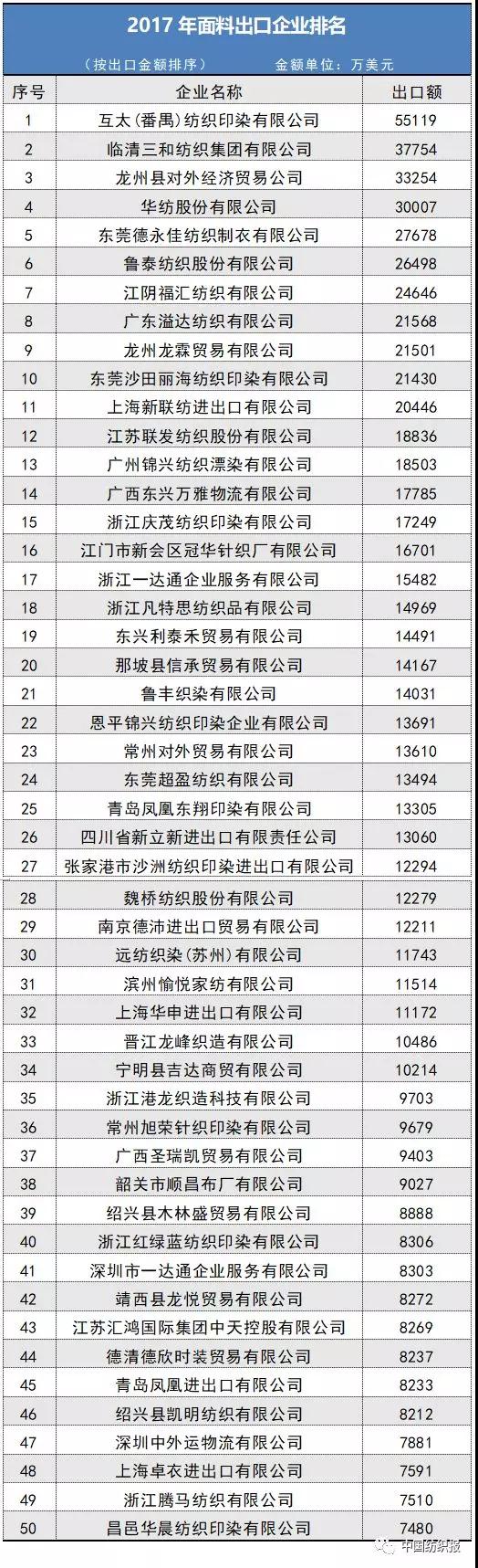 您現在的位置是:首頁 > 要聞 料、紗線、家紡品出口企業50強榜單出爐 來源:中國紡織報 發布日期:2018-06-13 字體: 【小】 【中】 【大】 近日,中國紡織品進出口商會發布中國紡織品服裝出口企業50強榜單,其中面料出口企業、紗線出口企業、家紡品出口企業排名陸續公布。榜單如下: 熱門文章: 聚力專精特新 共筑產業未來—2026中國紡聯春季聯展【紡織專... [2026-02-05] 鏈接全球家紡商機,2026intertextile秋冬展展位... [2026-02-04] 數讀2025 | 盤點全年中國紡織行業對外貿易表現 [2026-02-03] 以改革創新精神將社會工作各項決策部署落實到位--與會代表深入... [2026-01-28] 鏈接全球紡業,共啟“十五五”新篇--2026年紡織貿促會邀您... [2026-01-27] 展會直通車