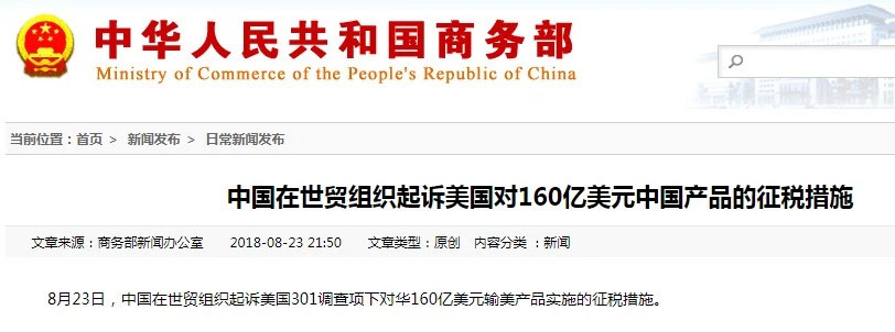 您現在的位置是:首頁 > 要聞 中國在世貿組織起訴美國對160億美元中國產品的征稅措施 來源:央視新聞 發布日期:2018-08-24 字體: 【小】 【中】 【大】 據商務部消息,中國于8月23日在世貿組織起訴美國301調查項下對華160億美元輸美產品實施的征稅措施。 熱門文章: 聚力專精特新 共筑產業未來—2026中國紡聯春季聯展【紡織專... [2026-02-05] 鏈接全球家紡商機,2026intertextile秋冬展展位... [2026-02-04] 數讀2025 | 盤點全年中國紡織行業對外貿易表現 [2026-02-03] 以改革創新精神將社會工作各項決策部署落實到位--與會代表深入... [2026-01-28] 鏈接全球紡業,共啟“十五五”新篇--2026年紡織貿促會邀您... [2026-01-27] 展會直通車