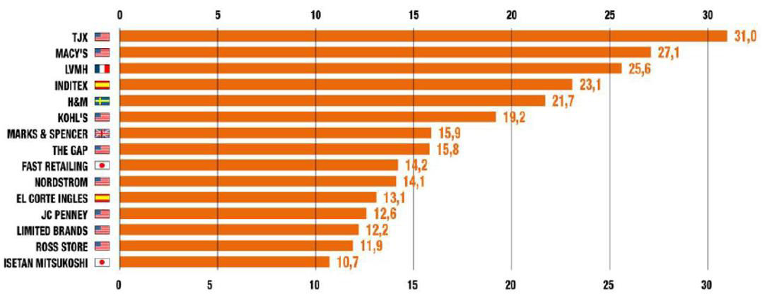 2017年全球30大時尚銷售商(單位:十億美元)