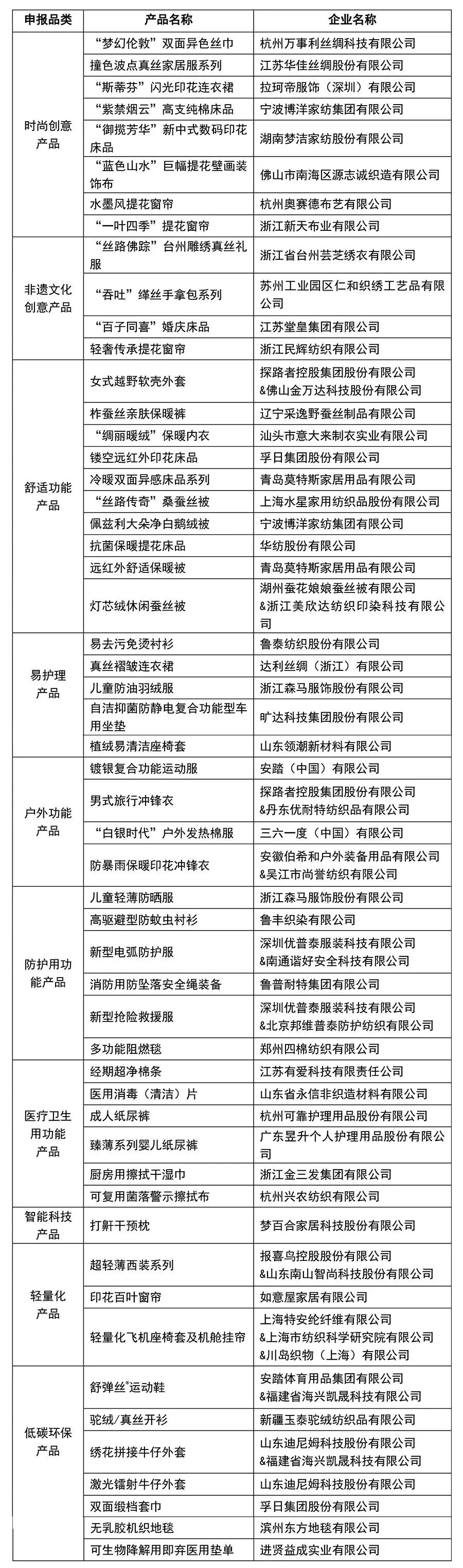 培育和推廣2018年度十大類紡織創新產品獲選產品及單位名單