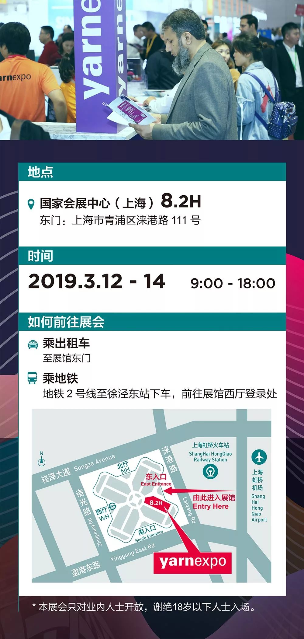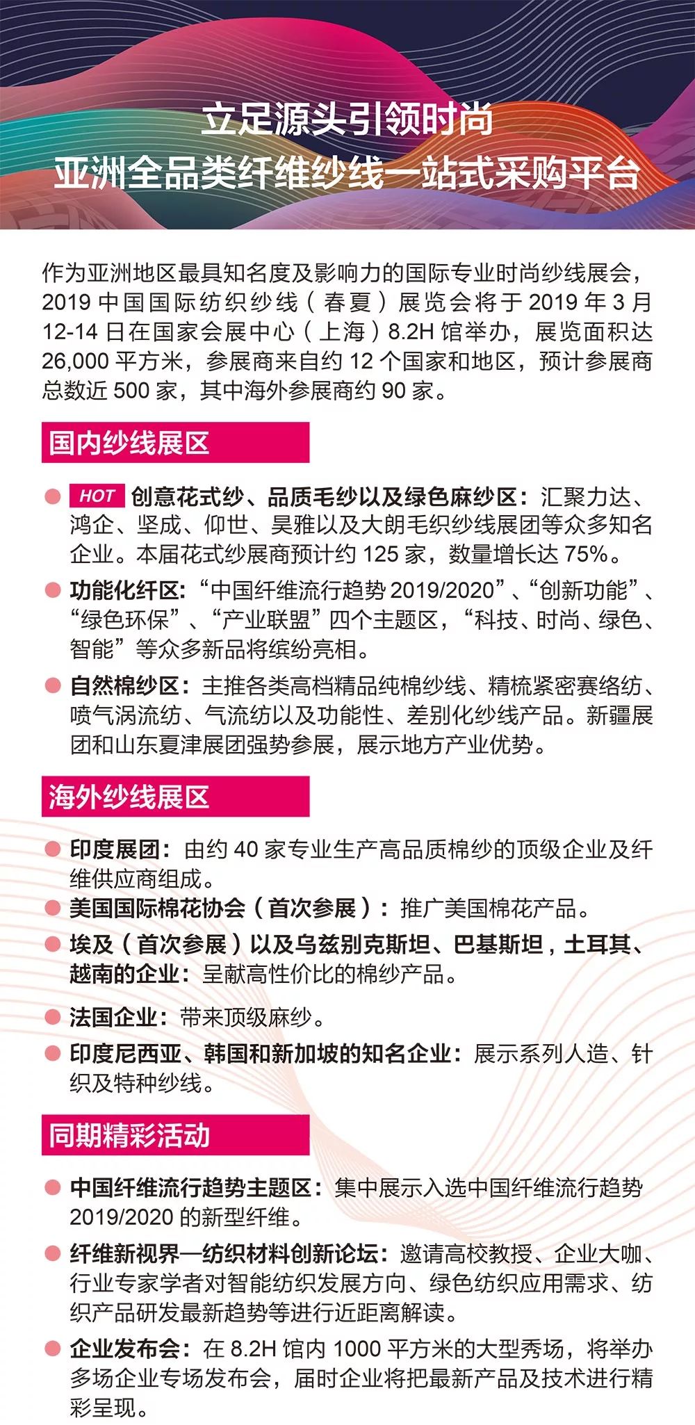2019中國(guó)國(guó)際紡織紗線(春夏)展覽會(huì)(簡(jiǎn)稱2019yarnexpo春夏紗線展)將于3月12-14日在國(guó)家會(huì)展中心(上海)8.2H館舉辦。展會(huì)面積26,000平方米,參展商來自12個(gè)國(guó)家和地區(qū),預(yù)計(jì)總數(shù)近500家,其中海外參展商約90家。