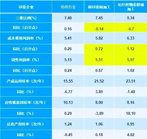 2018年,印染行業運行質效繼續改善。三費比例進一步下降,管理水平穩步提升。銷售利潤率提高,贏利能力進一步增強。應收賬款周轉率、總資產周轉率提高,運營效率逐步提高。企業生產運營及市場銜接狀況均較為順暢,運行質量穩步改善是印染行業經濟運行的一大亮點。