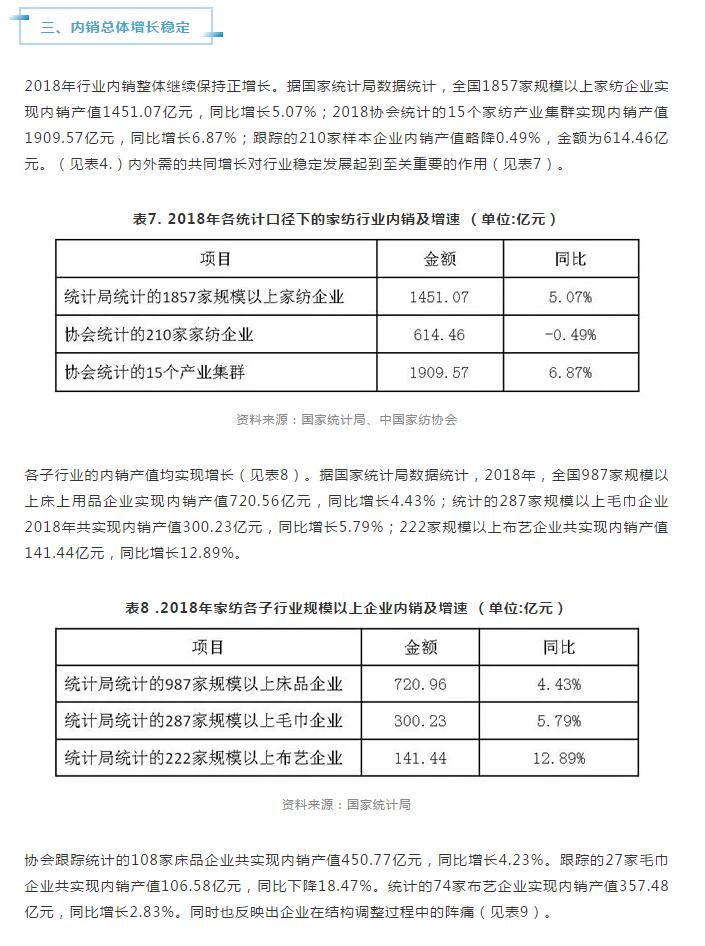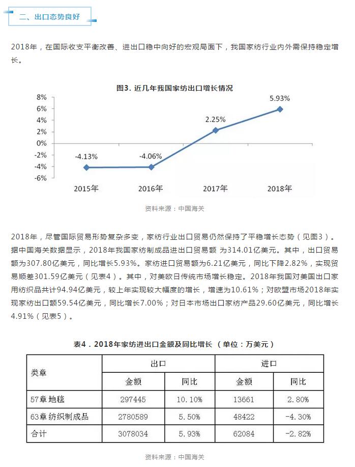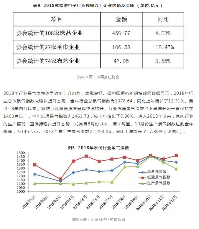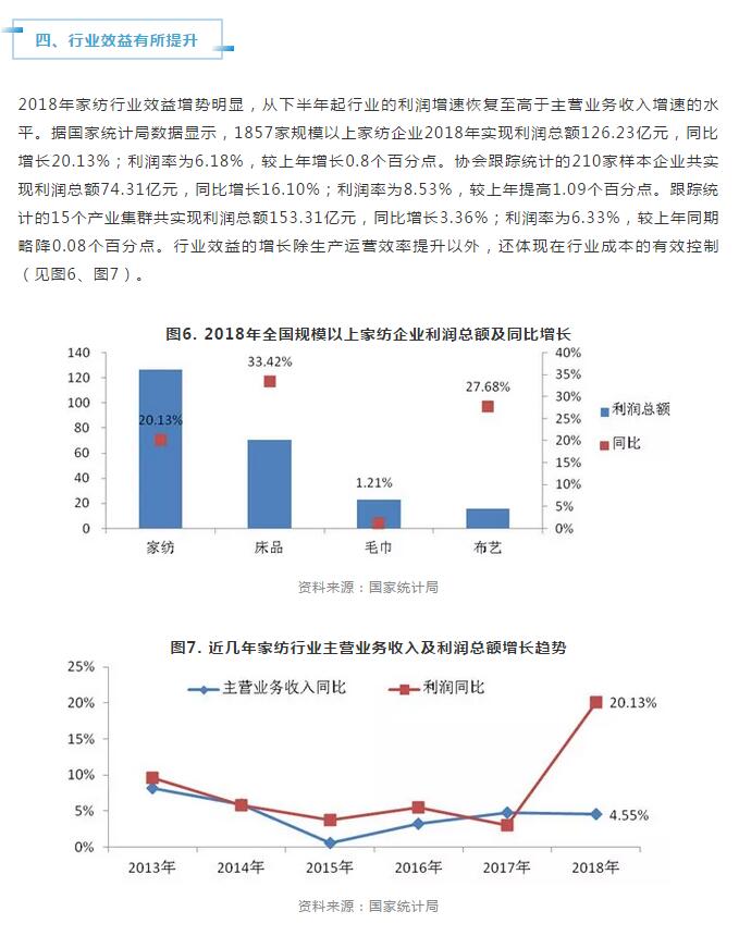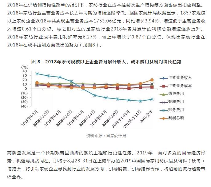 2018年家紡行業(yè)總體運(yùn)行保持平穩(wěn)增長,行業(yè)效益良好,成本得到有效控制,行業(yè)效率總體提高。反映出家紡行業(yè)在深入貫徹實(shí)施供給側(cè)結(jié)構(gòu)性改革方面取得的初步進(jìn)展,為行業(yè)持續(xù)保持高質(zhì)量發(fā)展打下基礎(chǔ)。