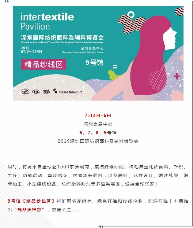 您現(xiàn)在的位置是:首頁 > 要聞 intertextile2019深圳國際面輔料展【精品紗線區(qū)】|經(jīng)典的 創(chuàng)新的,高品質棉紗也不錯 來源:紗線展官微 發(fā)布日期:2019-06-21 字體: 【小】 【中】 【大】 熱門文章: 聚力專精特新 共筑產(chǎn)業(yè)未來—2026中國紡聯(lián)春季聯(lián)展【紡織專... [2026-02-05] 鏈接全球家紡商機,2026intertextile秋冬展展位... [2026-02-04] 數(shù)讀2025 | 盤點全年中國紡織行業(yè)對外貿(mào)易表現(xiàn) [2026-02-03] 以改革創(chuàng)新精神將社會工作各項決策部署落實到位--與會代表深入... [2026-01-28] 鏈接全球紡業(yè),共啟“十五五”新篇--2026年紡織貿(mào)促會邀您... [2026-01-27] 展會直通車