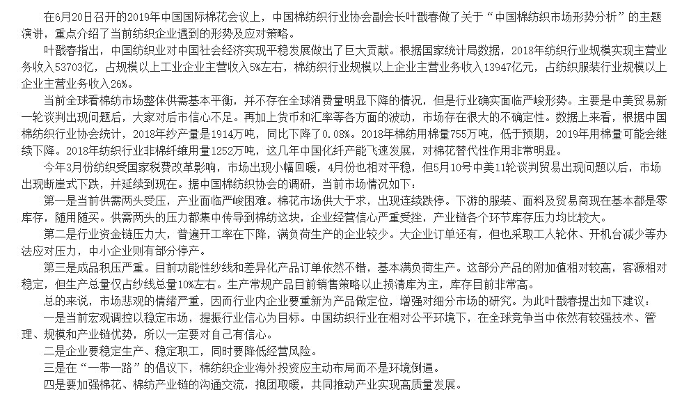 您現在的位置是:首頁 > 要聞 2019國際會議:中國棉紡織市場形勢分析 來源:中國棉花信息網 發布日期:2019-06-25 字體: 【小】 【中】 【大】 熱門文章: 聚力專精特新 共筑產業未來—2026中國紡聯春季聯展【紡織專... [2026-02-05] 鏈接全球家紡商機,2026intertextile秋冬展展位... [2026-02-04] 數讀2025 | 盤點全年中國紡織行業對外貿易表現 [2026-02-03] 以改革創新精神將社會工作各項決策部署落實到位--與會代表深入... [2026-01-28] 鏈接全球紡業,共啟“十五五”新篇--2026年紡織貿促會邀您... [2026-01-27] 展會直通車