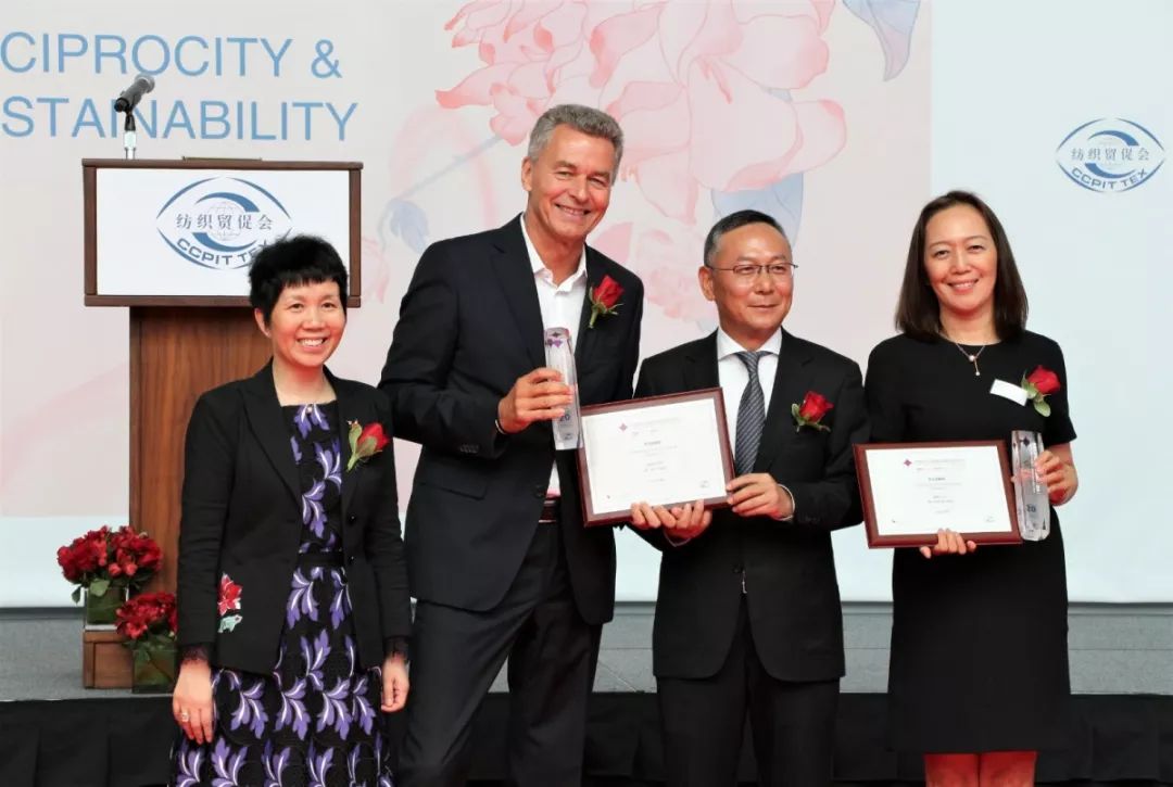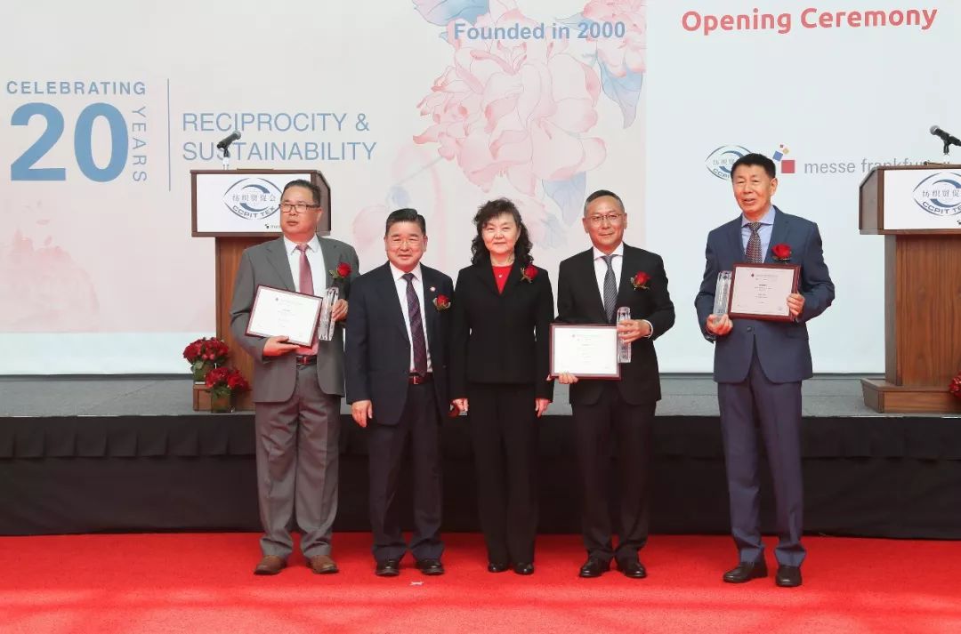 由中國紡織工業聯合會副秘書長兼外事辦公室主任袁紅萍和法蘭克福展覽公司全球董事Detlef Braun為徐迎新、溫婷頒發展覽會杰出貢獻獎。