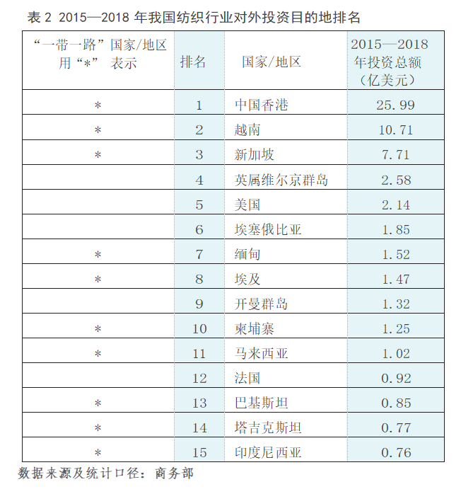 二是從投資區域來看,東南亞是當前我國紡織行業對外投資的重點區域, 歐美國家、非洲地區以及“一帶一路” 沿線的紡織行業投資項目逐年增多(具體見表2)。我國紡織業在海外生產力布局方面呈現出“中國大陸+東南亞+非洲”的布局模式。從吸引投資的國家和地區排名來看,越南排名第二(中國香港排名第一),累計吸引投資總額10.71 億美元,占比17.2%。美國是目前我國紡織行業在西方發達國家投資最多的目的地,累計直接投資總額為2.14億美元。埃塞俄比亞和埃及是我國紡織產業對非投資最多的兩個國家,累計投資存量分別為1.85億美元和1.47億美元。隨著“一帶一路”倡議的推進,紡織產業對“一帶一路”沿線國家和地區的投資明顯增多。